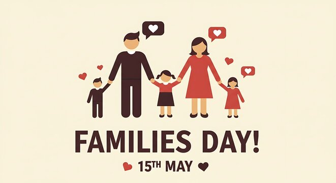 Stylized Happy Family Holding Hands Celebrating Families Day on May 15th with Hearts in a Flat Design, Illustrating Familial Love and Unity with Simple Shapes
