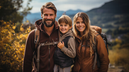 Adventurous family exploring a scenic hiking trail and enjoying the breathtaking views on their vacation, family vacation, summer, banner, natural light, affinity, bright backgroun Generative AI