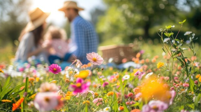 A happy family gathered in a natural landscape, enjoying a picnic amidst blooming flowers, lush grass, and under the warm sunlight. AIG41