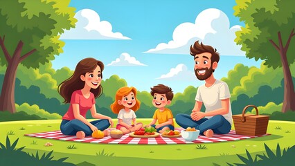 Young Family of four enjoying a walk in the forest, parents swinging the daughter, and the teenage children strolling alongside. for themes of family bonding and nature outings.