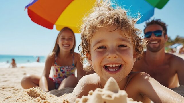 Joyful family enjoying autumn leaves celebrating thanksgiving together