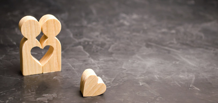A miniature couple in love and a heart near them. The concept of family problems and loss of feelings for your loved one. Consultation family psychologist. Rupture / divorce. Selective focus