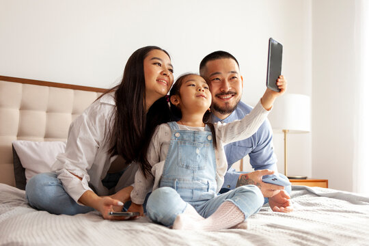 asian family sit on the bed and communicate via video call, little korean girl with mom and dad takes selfie