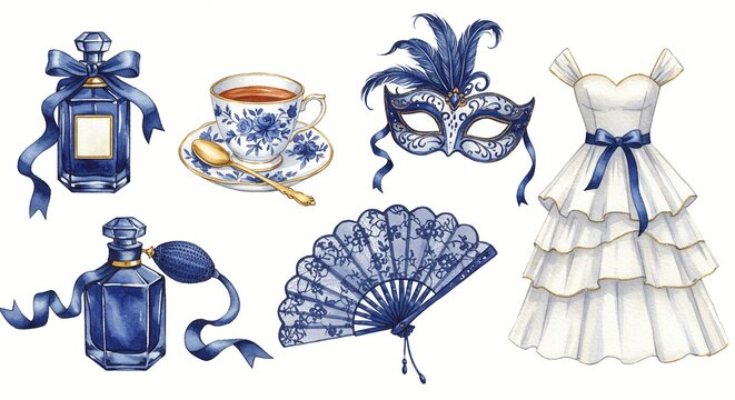 Elegant vintage-style watercolor art featuring perfume, a tea cup, a mask, a fan, and a dress with blue accents on a white background.