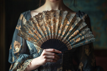 A mysterious vintage woman in elegant attire holds an ornate fan partially hiding her face enhancing her allure