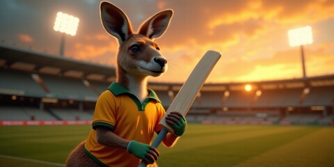 A playful kangaroo dressed in cricket attire stands with a bat at a stadium during sunset, embodying the spirit of sports and Australian culture.