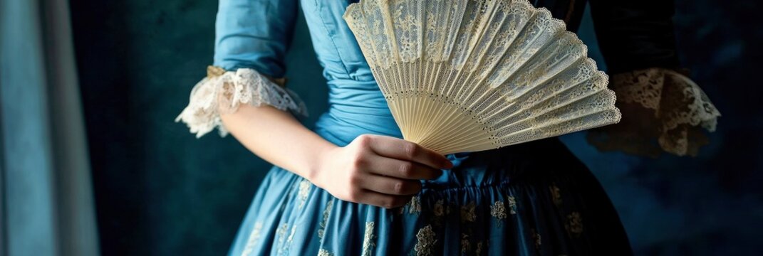 Woman in a blue regency dress holding an elegant white lace fan