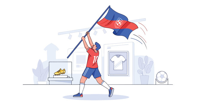 Soccer fan enthusiastically waves flag at soccer memorabilia gallery celebrating victory and team spirit reflecting the passion for the sport in