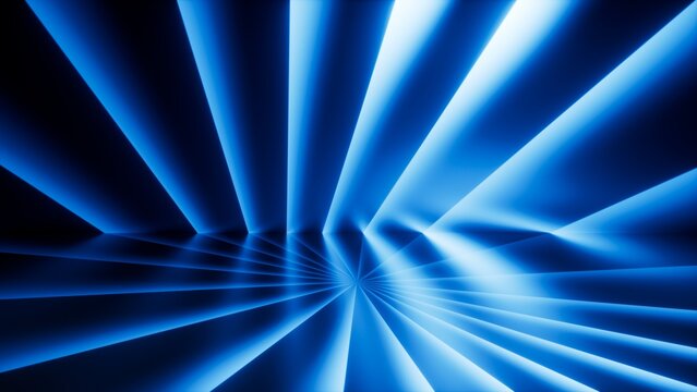 Abstract neon light background. Intense blue laser rays fan out with reflection, forming a starburst structure reminiscent of dynamic lighting effects in clubs. 3d render illustration.