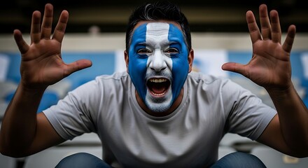 Passionate fan with a painted face is cheering in a crowded sports stadium
