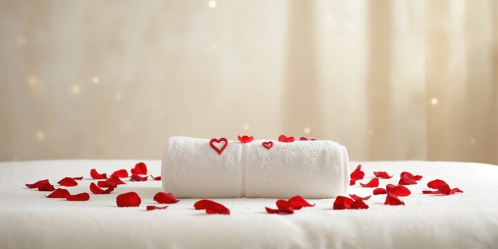 White towel with red love heart symbols used as decor in a room, emphasizing cleanliness and romance
