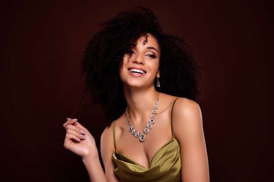 Photo of attractive lovely pretty lady enjoy vogue party wear accessories jewel dress on dark brown color background
