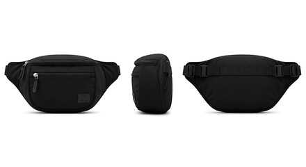 Versatile black fanny pack mockup with front, side, and back views. Realistic waist bag template for accessory and apparel branding.