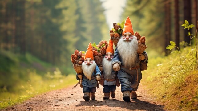 A family of gnomes is walking along a forest path and carrying baskets full of cones and nuts. A cute and whimsical fairy tale character. Fantasy scenery. Illustration for cover, card, interior design