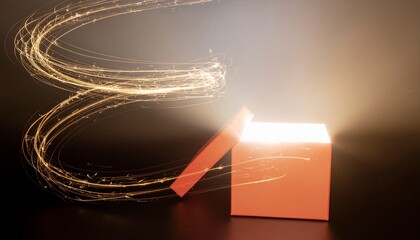 Box with Swirling Light Trails. Gift box with sparkling light. A orange gift box with the lid being pulled off featuring fast swirling light trails of golden energy spinning out and around the box.