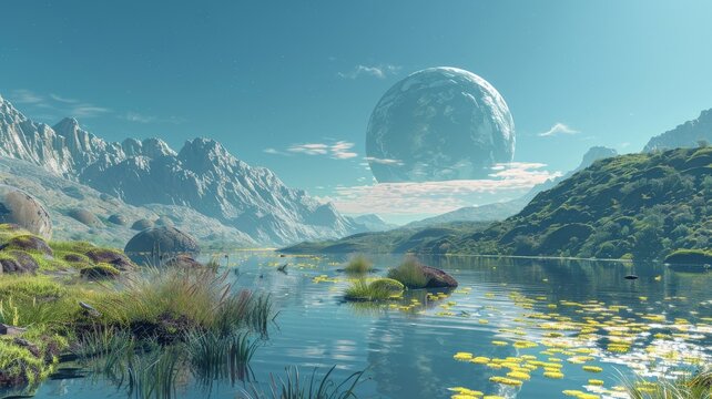scene on an alien world. Strange environment concept. A world in another universe 3D rendering