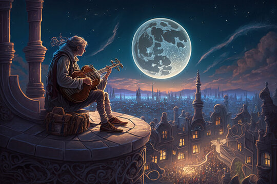Bard playing magical instrument on moonlit rooftop, overlooking fantastical city. fantastical with a whimsical quality, and the light setting creates a sense of romanticism and enchantment. Ai