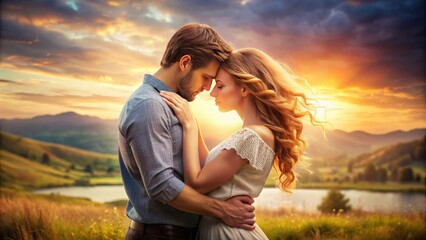 A magical woman embraces a warrior man, evoking a sense of love and strength, perfectly suited for a captivating fantasy novel cover. AI generated
