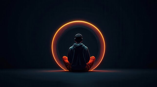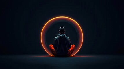 A lone storyteller sitting inside a glowing soundwave bubble, podcast as an immersive world