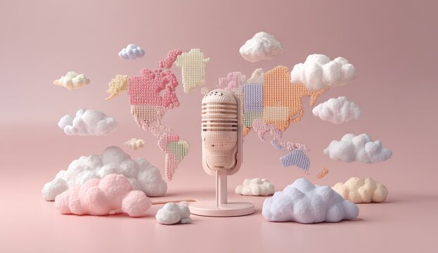 Vintage microphone standing on a stylized world map surrounded by fluffy clouds against a gradient pink and blue background