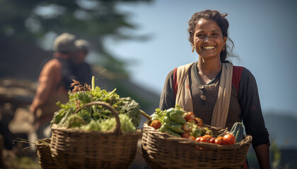 Young woman holding a basket of vegetables. Created by using generative AI tools