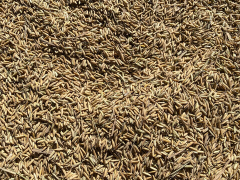 Close-up photo of farmers are drying paddy rice grains after harvested using sunlight. Concept for agriculture, urban farming, food security, stability, World FAO United Stations Organization.