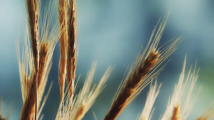the spikes of golden wheat in the wind at harvest time. close up