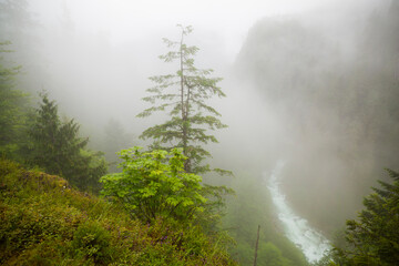 A break in the clouds reveals the Cascade River flowing far below, as seen from an overlook on Cascade River Road in Mount Baker-Snoqualmie National Forest, Washington.