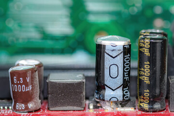 Close up of Electrolytic capacitor row with various sizes place on electronic circuit board