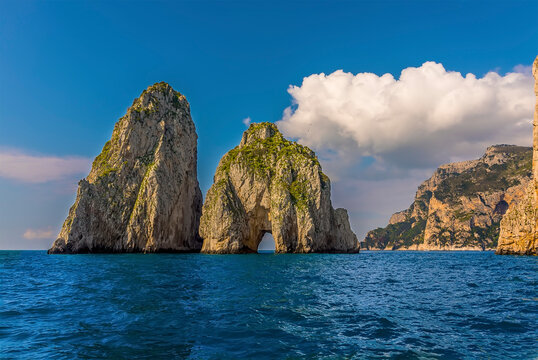 Cumulus clouds hover over the Faraglioni rocks on the eastern side of the Island of Capri, Italy