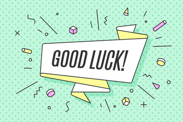 Ribbon banner with text Good Luck for emotion, blame and curiosity. Retro hand drawn design element for banner, advertising, poster in web and internet theme, memphis style. Vector Illustration