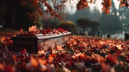 A serene autumn scene featuring a coffin surrounded by vibrant fallen leaves, evoking themes of remembrance and the passage of time.