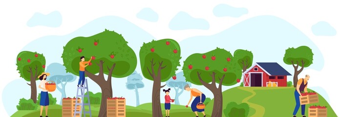 Rustic silhouette illustration of farmers harvesting apples from a tree and grain from a field, showcasing traditional autumn farm work and rural life.