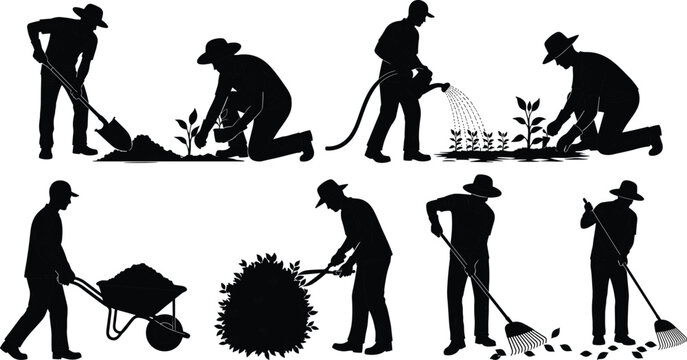 Silhouettes of gardeners performing various tasks including digging planting watering pruning raking and transporting soil