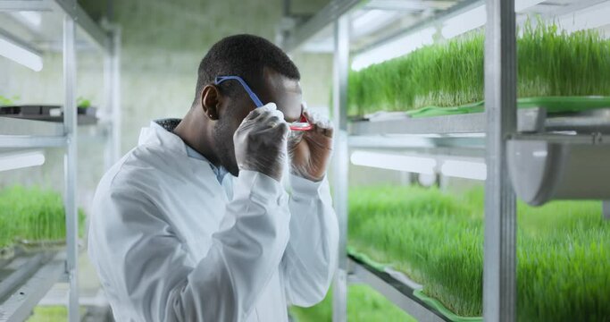 Ecology greenhouse, tablet and team with test tube research plant growth, agriculture environment or farm sustainability. Collaboration, teamwork and diversity black man and woman study eco field