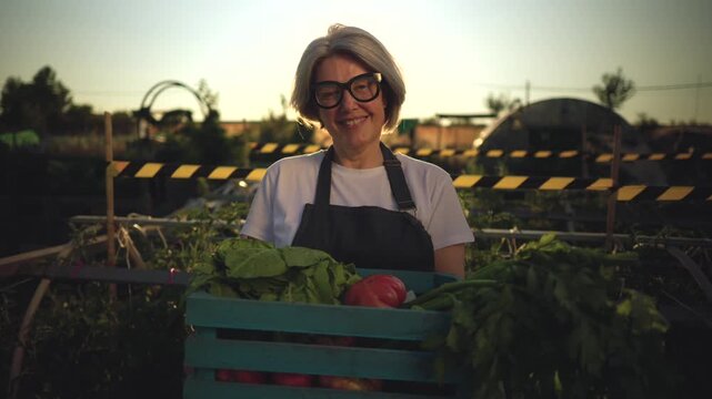 Happy senior female farmer holding a wooden crate full of fresh organic vegetables, smiling proudly in her garden at sunset, embodying a healthy and sustainable farm to table lifestyle