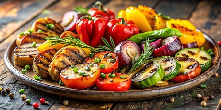 Grilled Vegetables on Metal Plate - Delicious Summer BBQ Food Stock Photo