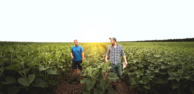 Two farmers in an agricultural field of sunflowers. Agronomist and farmer inspect potential yield