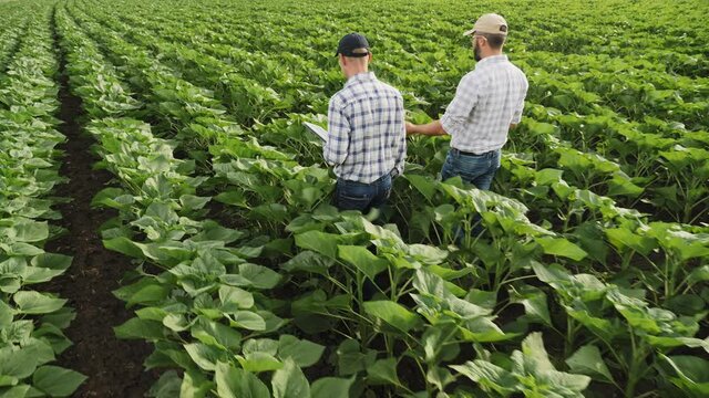 Rear view of two farmers talking while walking through a green field of young sunflowers, examining plant growth