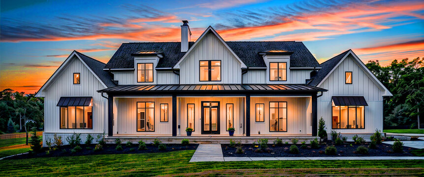 Beautiful modern farmhouse style luxury home exterior at twilight
