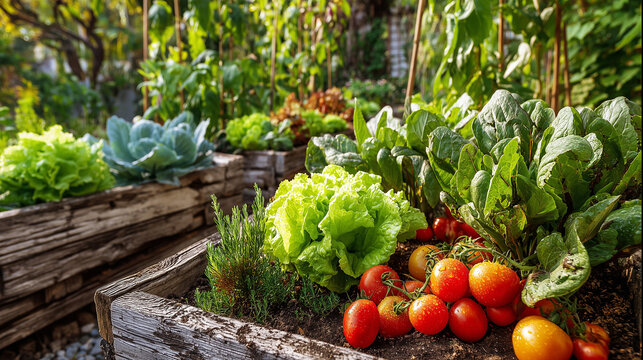 Fresh vegetables growing in a well maintained home garden with tomatoes lettuce peppers and herbs natural environment realistic plants vibrant colors organic gardening concept professional stock photo