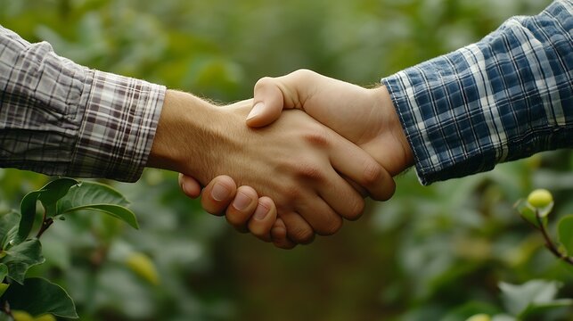 Business handshake on a farm background, signifying a deal or agreement. Generative AI