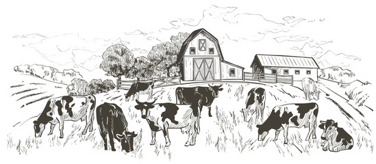 Agriculture industry, farming and animal husbandry concept. Summer rural landscape with cows, fields and farm. Vector illustration.