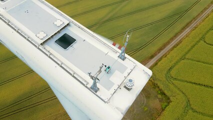 Close up elements of Large wind turbine with rotating blades generate green energy in field. Electricity, ecological saving and alternative power source