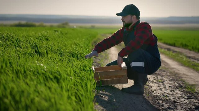 Human and nature, farmer stroking green plant in farmland in summer day. Professional agronomist or farm worker, individual farming in ecological area, summertime in countryside, love to nature