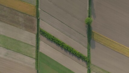 Aerial view of geometric farmland plots in rural Germany, showcasing contrasting colors and textures in precise grid-like arrangements during harvest season