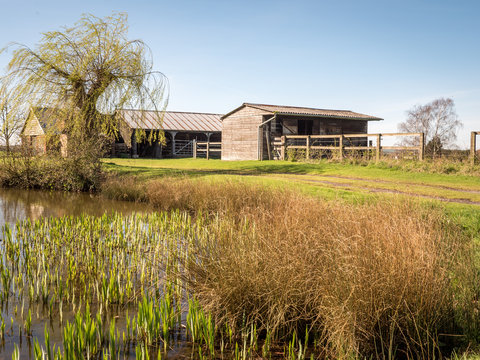 Farm stables and pond. A rural English farmyard scene with wooden horse stables by a natural pond and willow tree enjoying early spring growth.
