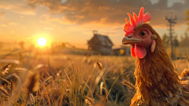 A plucky chicken wielding cutlery stands ready for dinner against the backdrop of a bustling farmyard at sunset