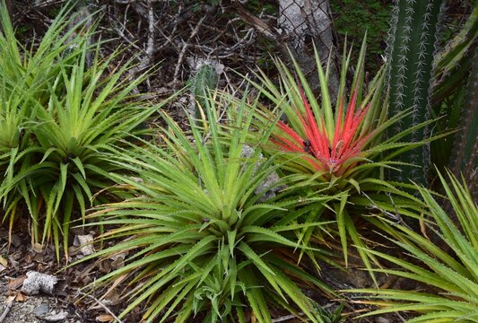 Lush green tropical plants in a garden setting, Fascicularia pitcairnifolia bicolor red and green