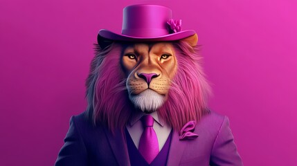 2d A lion in a pink elegant hat on a pink background. Front view, lion portrait with pink fur. Dressed in a suit and tie with bright colors and strong contrast, this design emphasizes elegance in fash